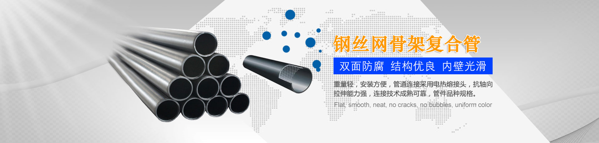 我們主要生產銷售:鋼絲網骨架復合管、鋼絲網骨架聚乙烯復合管、孔網鋼帶聚乙烯復合管、鋼骨架聚乙烯塑料復合管、電熔管件、HDPE中空壁纏繞管、HDPE內肋增強螺旋波紋管、HDPE結構壁增強B型管等一系列產品。復合管以其特有的防腐蝕、耐磨、耐高溫、抗嚴寒、耐壓、抗蠕變、穩定性好、安裝方便等特點,逐步取代各類金屬管件和塑料管件,被應用于消防、石油、化工、供水、采礦、海水輸送等領域...